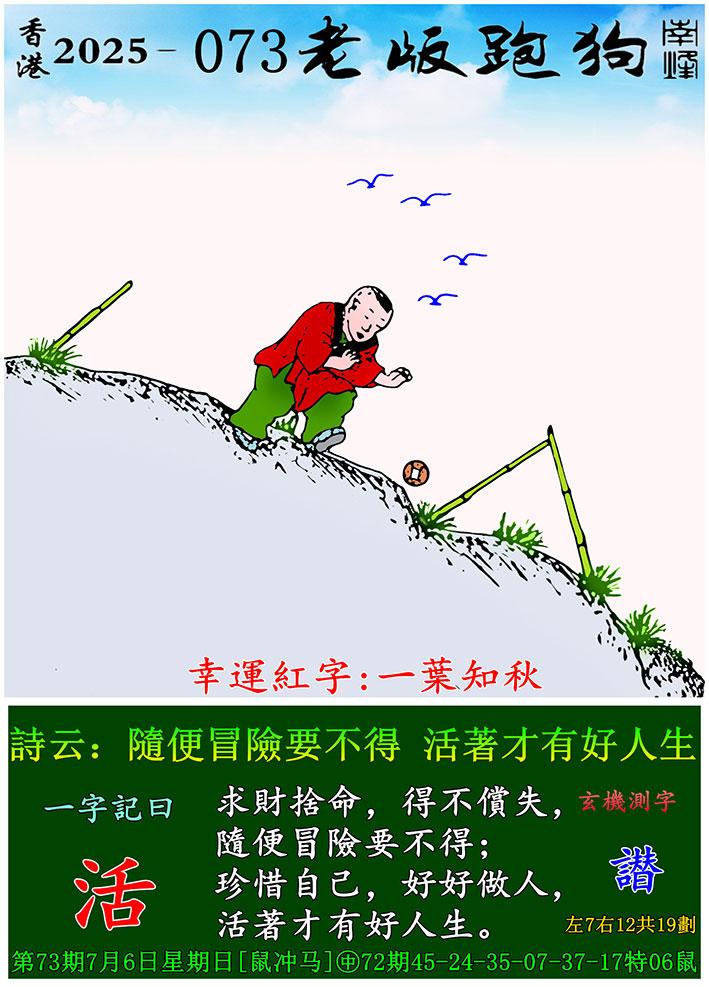 073期老版跑狗一字記之曰:【活】 詩雲:隨便冒險要不得,活著才有好人生。