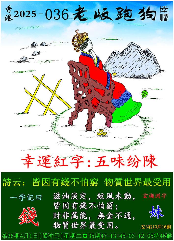 036期老版跑狗一字記之曰:【錢】 詩雲:皆因有錢不怕窮,物質世界最受用。