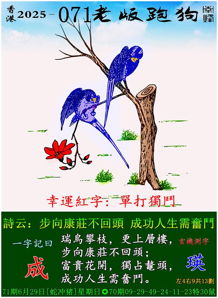 071期老版跑狗一字記之曰:【成】 詩雲:步向康莊不回頭,成功人生需奮鬥。