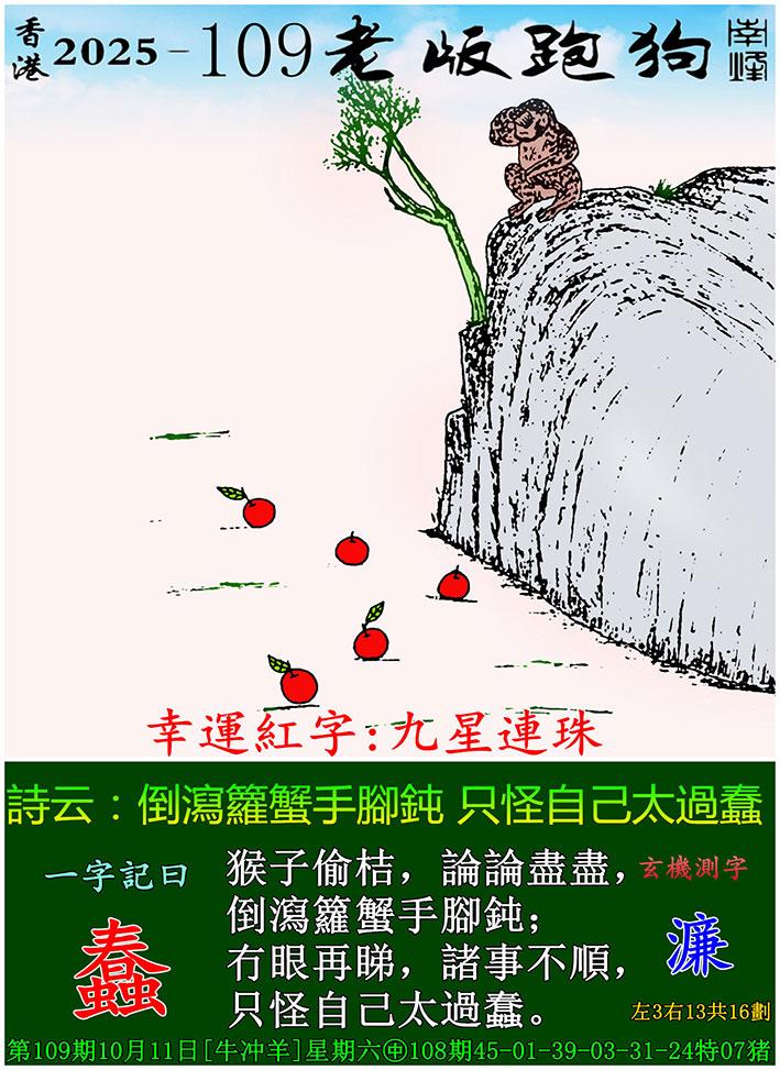 109期老版跑狗一字記之曰:【蠢】 詩雲:倒瀉籮蟹手腳鈍,只怪自己太過蠢。