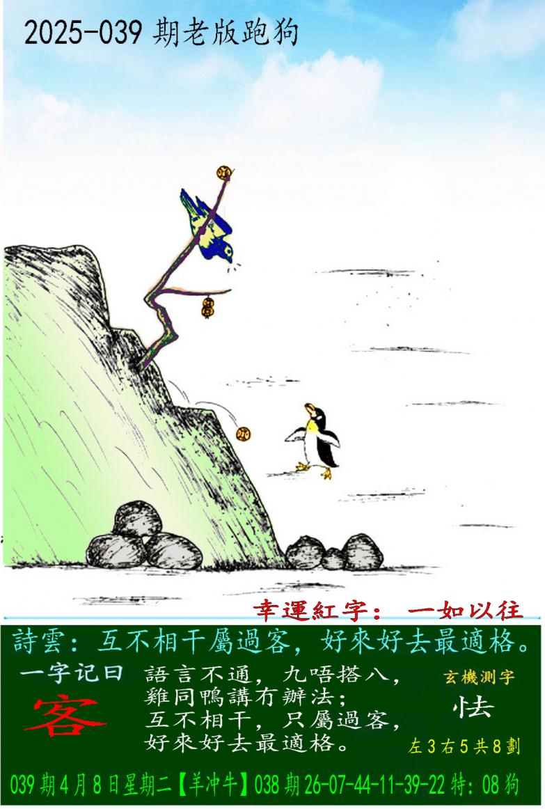 039期老版跑狗一字記之曰:【客】 詩雲:互不相干屬過客,好來好去最適格。